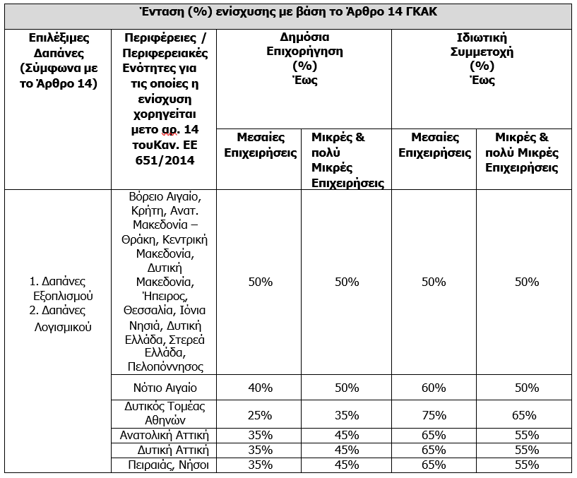 Για τις δαπάνες που ενισχύονται βάσει του Άρθρου 14 «Περιφερειακές Επενδυτικές ενισχύσεις» του ΓΚΑΚ, οι εντάσεις τους διαμορφώνονται ακολούθως (Χάρτης Περιφερειακών Ενισχύσεων 2022-2027):